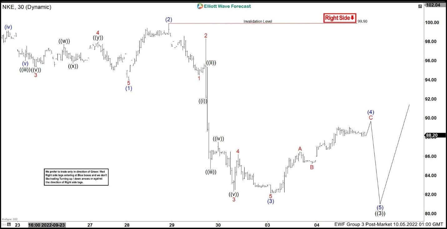 Near term, the Elliott Wave view on Nike (NKE) suggests that cycle from 9.13.2022 high is in progress as a 5 waves impulse. Down from 9.13.2022 high, wave (1) ended at 94 and rally in wave (2) ended at 99.89. Nike then resumed lower in wave (3) with internal subdivision as another impulse in lesser degree. Down from wave (2), wave 1 ended at 94.48 and wave 2 ended at 98.32. Wave 3 ended at 82.33, wave 4 ended at 86.20 and final leg lower wave 5 ended at 82.15 which completed wave (3). Wave (4) rally is in progress as a zigzag Elliott Wave structure. Up from wave (3), wave A ended at 86.47 and pullback in wave B ended at 85.25.