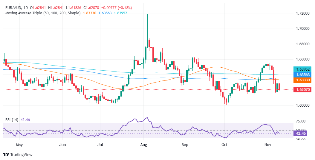 The EUR/AUD remains consolidates, as shown in the daily chart. However, it’s slightly tilted to the downside, as the exchange rate persists below the confluence of the 20, 50 and 100-day Simple Moving Averages (SMAs). This and the Relative Strengt Index (RSI) falling deeper, hints the cross could crack the 1.6200 in the short term.