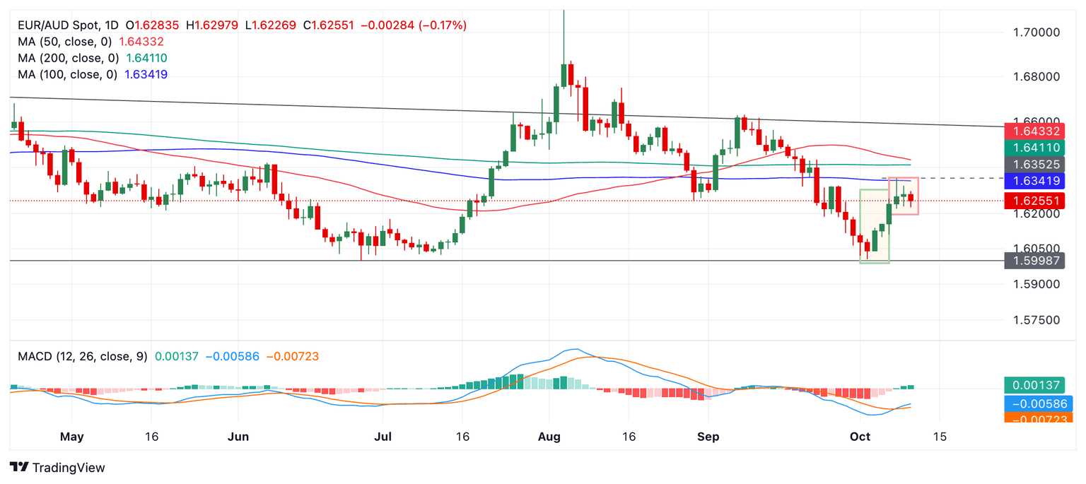 EUR/AUD bottomed out at 1.6000 and started rising last week, recovering back up to the 1.6300s before pulling back to where it is currently consolidating in the 1.62s.