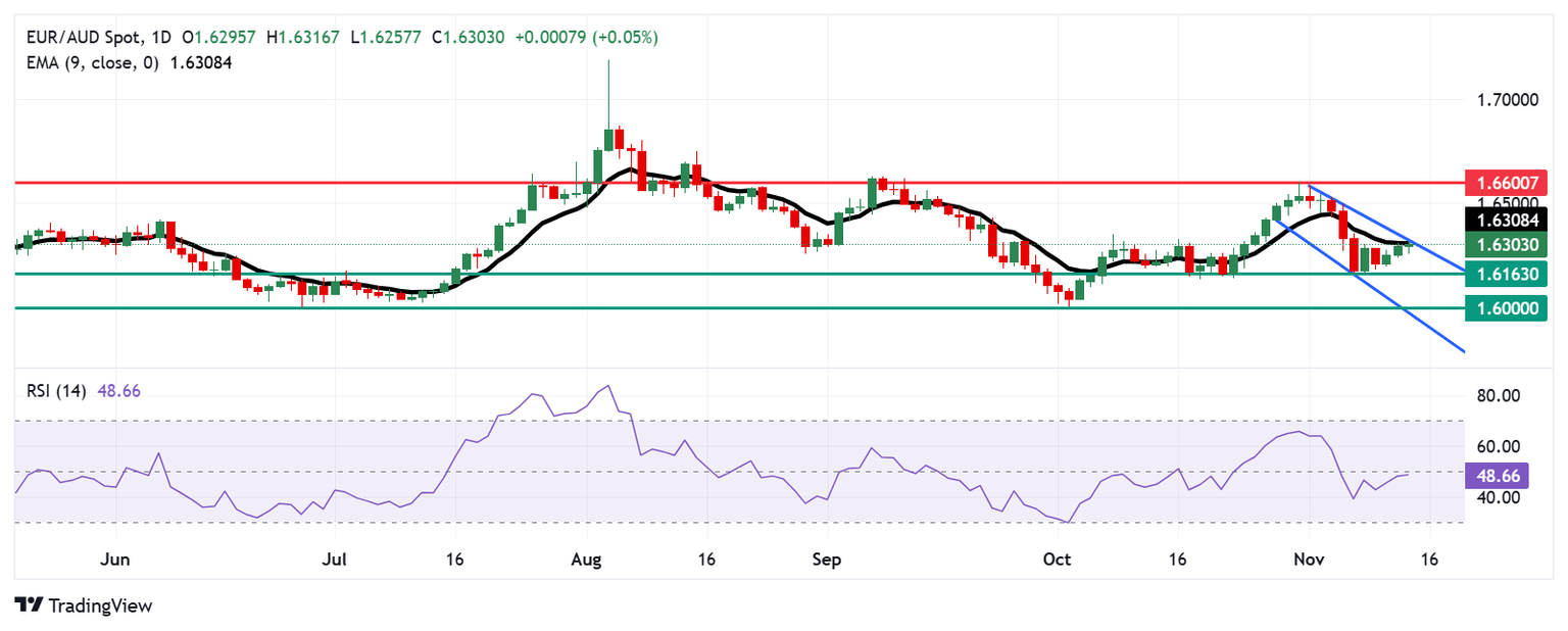 On the upside, the EUR/AUD cross tests the immediate resistance at the nine-day Exponential Moving Average (EMA) at the 1.6308 level, aligned with the upper boundary of the descending channel. A breakout above this channel could weaken the bearish bias and support the cross to navigate the region around its two-month high of 1.6600, which was recorded on November 1.