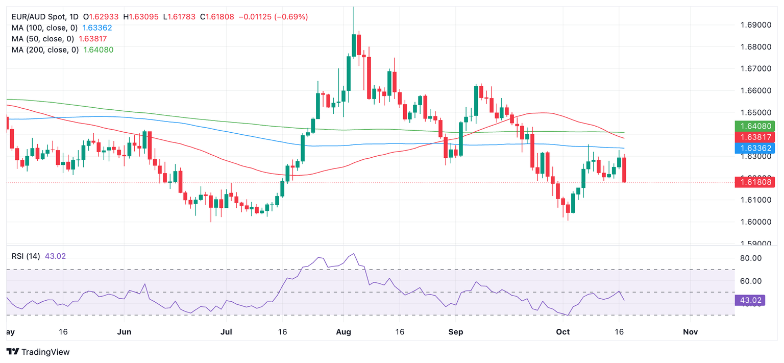 EUR/AUD falls by almost three-quarters of a percent to the 1.6180s on Thursday after a combination of stronger-than-expected Australian labor market data boosted the Australian Dollar (AUD) whilst the Euro (EUR) depreciated ahead of the European Central Bank’s (ECB) decision to cut interest rates, and remained under pressure as the bank telegraphed a mildly negative economic outlook for the region going forward.