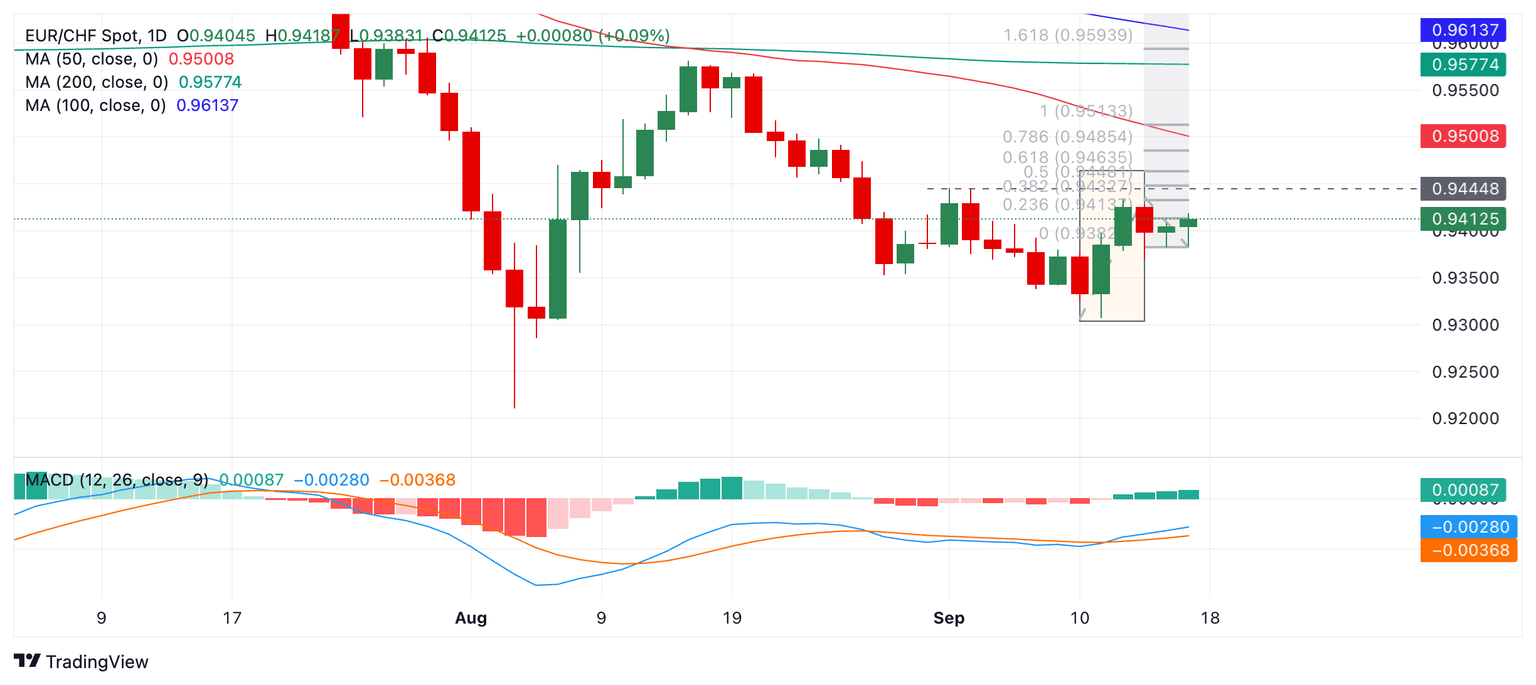 EUR/CHF reached a temporary bottom on September 11 and recovered. It is currently trading above 0.9400. There are signs that suggest it could continue higher despite the overall bearish medium-term trend.