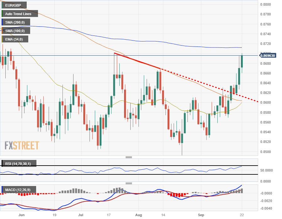The EUR/GBP stretched for the 0.8700 major handle in Friday trading, closing the week with over a full percent of upside gains with the Euro (EUR) seeing its best trading week against the Pound Sterling (GBP) since early February.