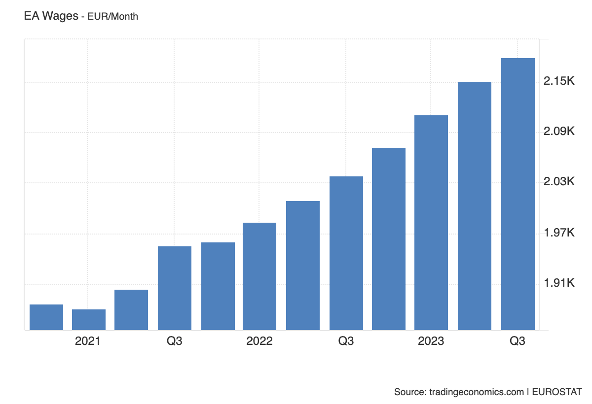 According to Q2 Wage Growth data, Eurozone wages rose 4.5% which, though lower than the 5.2% in the previous quarter, remained high. There is still no data for Q3, however, but the Eurozone Average Monthly Wage continues to rise quite strongly, reaching EUR 2,180 in September.