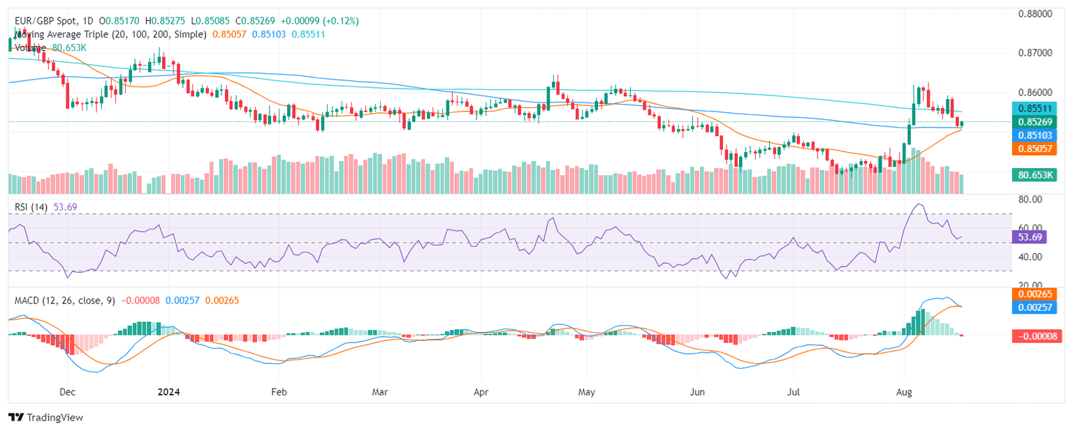 The EUR/GBP pair suggests a mix of bullish and bearish signals. The Relative Strength Index (RSI) is currently at 53, indicating a slight upward trend in buying pressure. However, the Moving Average Convergence Divergence (MACD) has printed a fresh red bar, suggesting a potential shift towards bearish momentum. Volume patterns have been mixed, with recent sessions exhibiting lower volume compared to large spikes observed earlier in the month.