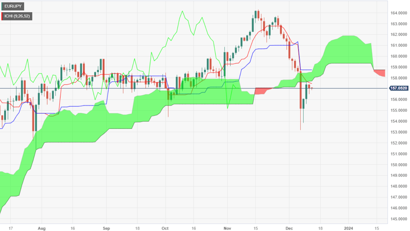 The daily chart portrays the pair as downward biased due to price action falling below the Ichimoku Cloud and crossing the Tenkan-Sen below the Kijun-Sen. For a bearish resumption to continue, bears need to step and push prices below the December 11 daily low of 155.86. Once cleared, the next support would be the December 8 low of 153.86, ahead of the December 7 swing low of 153.11