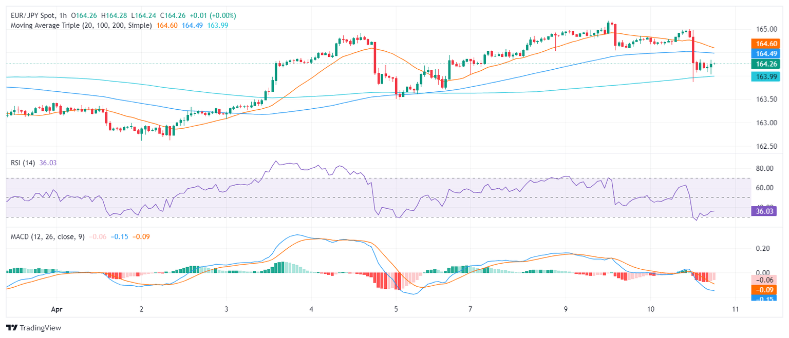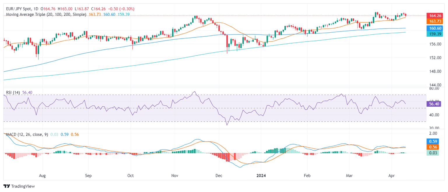 The EUR/JPY pair is trading at 164.25 and has decreased by 0.30% in Wednesday’s session. Despite being positioned above its key Simple Moving Averages (SMAs), the pair is experiencing a potential shift in momentum from bulls to bears with technical indicators losing traction.