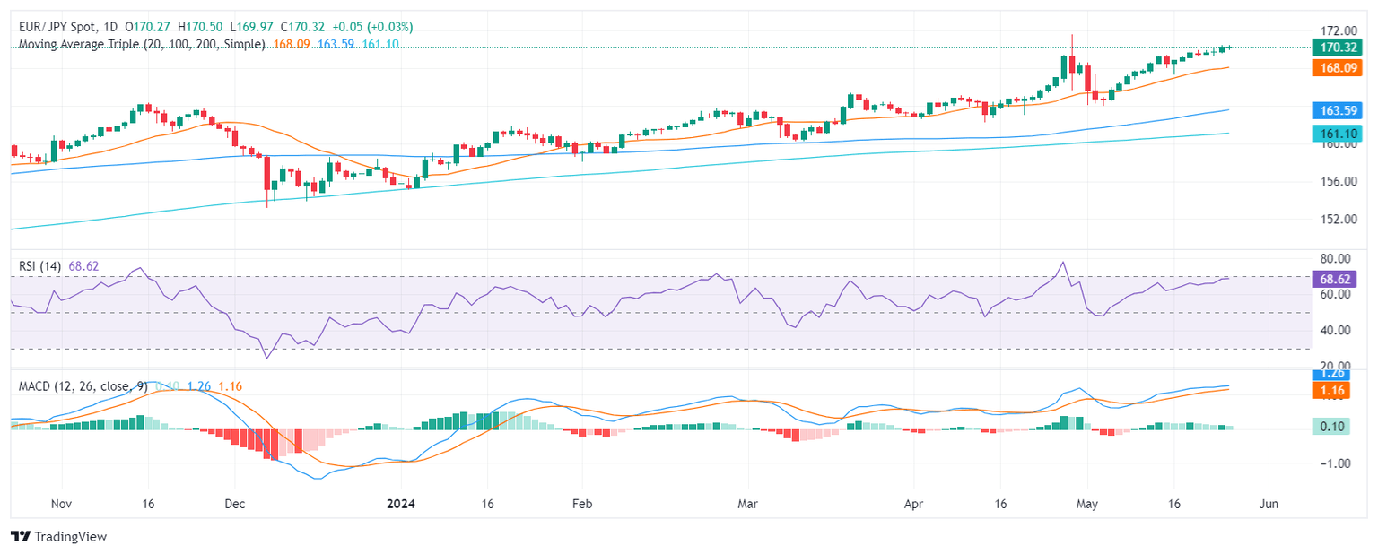 In the daily analysis, the Relative Strength Index (RSI) for the EUR/JPY pair has been observing a steady positive trend. It points out that buyers hold a strong position with the latest reading nearing overbought territory. Concurrently, the Moving Average Convergence Divergence (MACD) histogram fortifies this stance, demonstrating flat green bars symbolizing a steady but flattening positive momentum.