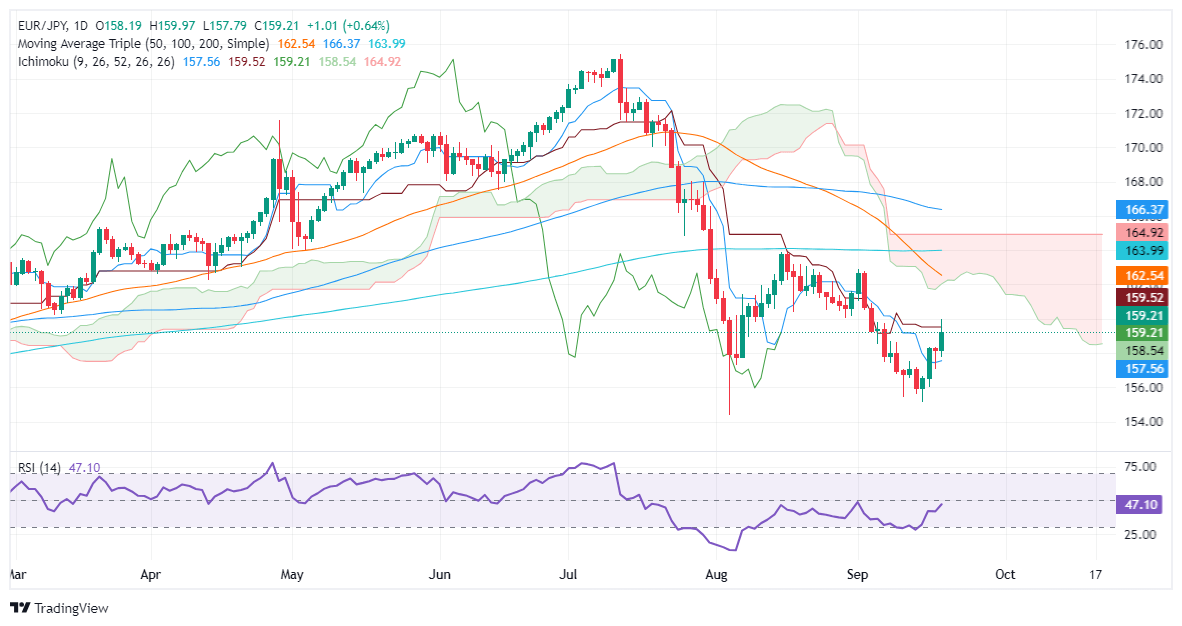 From a technical standpoint, the EUR/JPY remains bearish, with price action standing below the Ichimoku Cloud (Kumo) and the 200-day moving average (DMA). Although the cross spiked toward 160.00 in a short time, it has failed to remain above the Kijun-Sen at 159.51, which opens the door for a pullback. If EUR/JPY drops decisively below 159.00, the next support would be the Senkou Span A at 158.53, followed by the psychological 158.00 figure ahead of the Tenkan-Sen at 157.55.