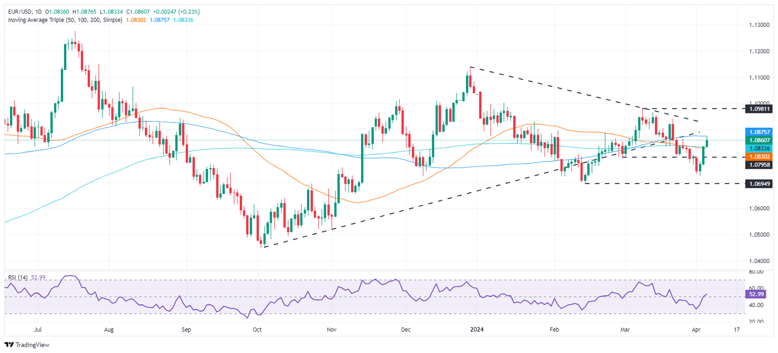- EUR/USD rises to 1.0858, facing resistance at the 100-day MA, influenced by US data and Eurozone PMIs.