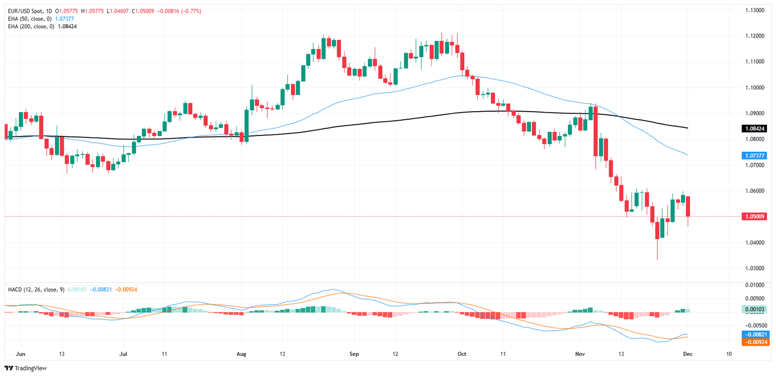 EUR/USD kicked off another trading week with a decline back into familiar near-term lows, flubbing a fresh run at the 1.0600 handle and backsliding into 1.0500, shedding nearly eight-tenths of a percent on Monday. US Purchasing Managers Index (PMI) figures beat the street but still came in below the 50.0 contraction level, bolstering the safe haven Greenback.