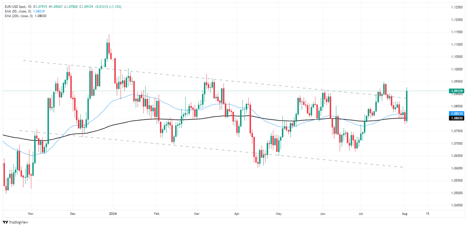 EUR/USD caught a ride higher on Friday after the Greenback got pummeled following a bad data beat in US Nonfarm Payroll (NFP) figures. Market fears of an accelerating economic slowdown in the US sparked a firm risk-off bid throughout global markets, but with US data going too far into the red too fast, the US Dollar got caught up in the stampede and tumbled across the board.
