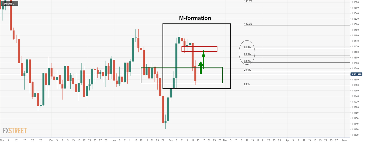 EUR/USD is trading higher by some 0.12% in Asia with the euro catching a bid as it attempts to correct vs the greenback in what appears to be 'wait and see' market conditions unfolding. The bulls moved on the lows of Monday's trade and stay in control through Asia, despite Russian invasion jitters and a wobble in Asian equities.