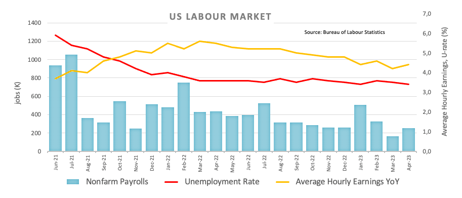 - US Non-farm Payrolls surprised to the upside in April.