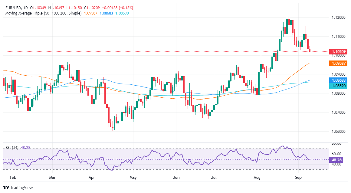 The EUR/USD retreated on Tuesday after the latest inflation report in Germany, which increased the likelihood of another interest rate cut by the European Central Bank (ECB). At the time of writing, the EUR/USD trades at 1.1021, virtually unchanged, as Wednesday’s Asian session begins.