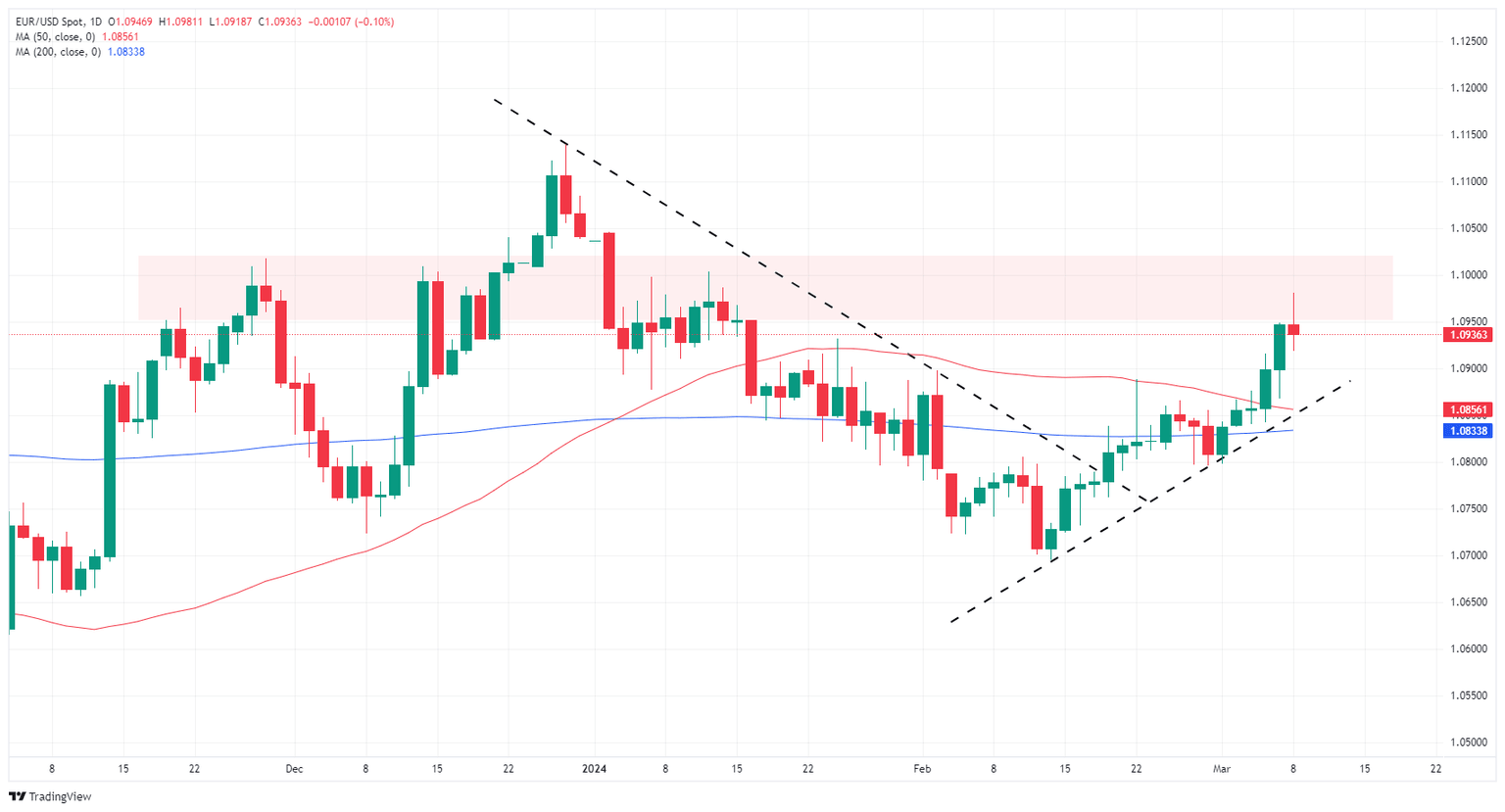 EUR/USD has closed bullish for all but three of the last 17 straight trading days, but that run will be threatened if the pair closes below 1.0951. The Euro is trading well above the 200-day Simple Moving Average (SMA) at 1.0833, extending a bullish recovery after catching a firm bounce from a pullback to 1.0800.