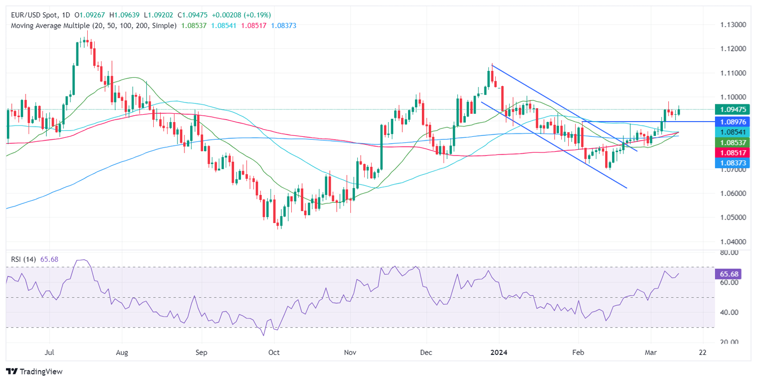 The EUR/USD registered solid gains of 0.19% on Wednesday, courtesy of a softer US Dollar amidst high US Treasury bond yields. An absent economic docket in the US, left traders adrift to Eurozone economic data and European Central Bank (ECB) speakers. At the time of writing, the pair exchanges hands at 1.0948 and gains 0.01% as the Thursday Asian session begins.