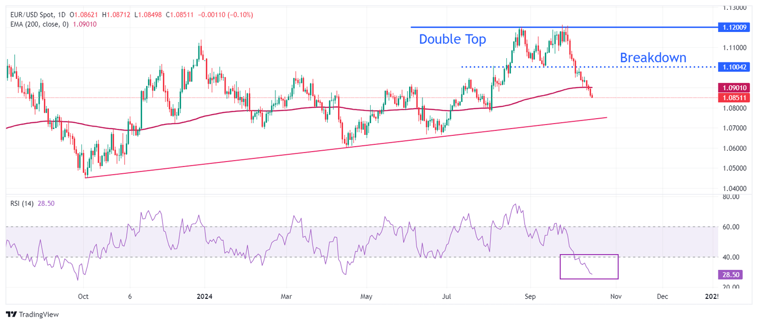 EUR/USD slides inch closer to near 1.0800 in early North American trading hours. The major currency pair extends its downfall after breaking below the 200-day Exponential Moving Average (EMA), which trades around 1.0900, earlier this week.