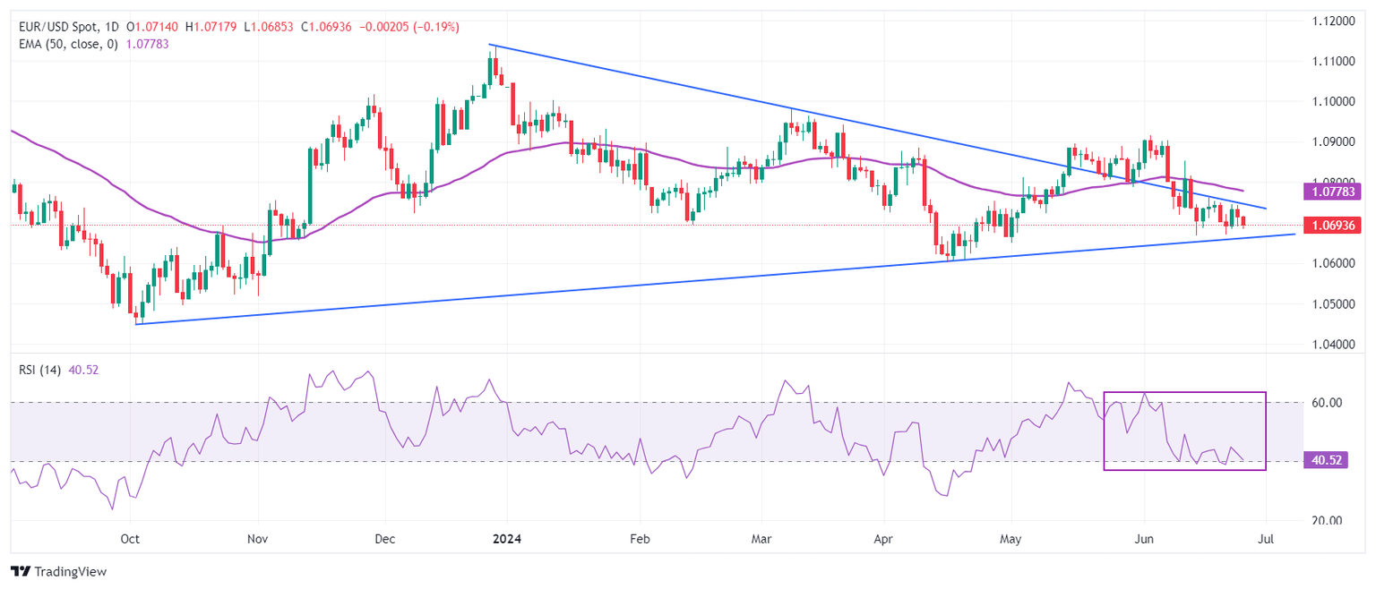 EUR/USD declines below the round-level support of 1.0700 in Wednesday’s American session. The major currency pair remains on the backfoot as the Euro’s near-term outlook weakens amid uncertainty over European Union (EU) legislative elections and growing speculation that the European Central Bank (ECB) could deliver subsequent rate cuts.