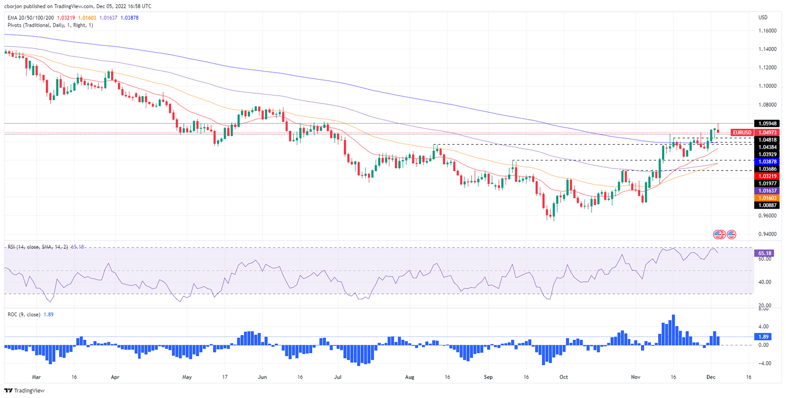 From a technical perspective, the EUR/USD daily chart is neutral-upward biased after breaking above the 200-day Exponential Moving Average (EMA) at 1.0388. As the EUR/USD rose to six-month highs at 1.0594, registering successive series of higher highs, oscillators like the Relative Strength Index (RSI) and the Rate of Change (RoC) did not, so a negative divergence between price action/oscillators, emerged.