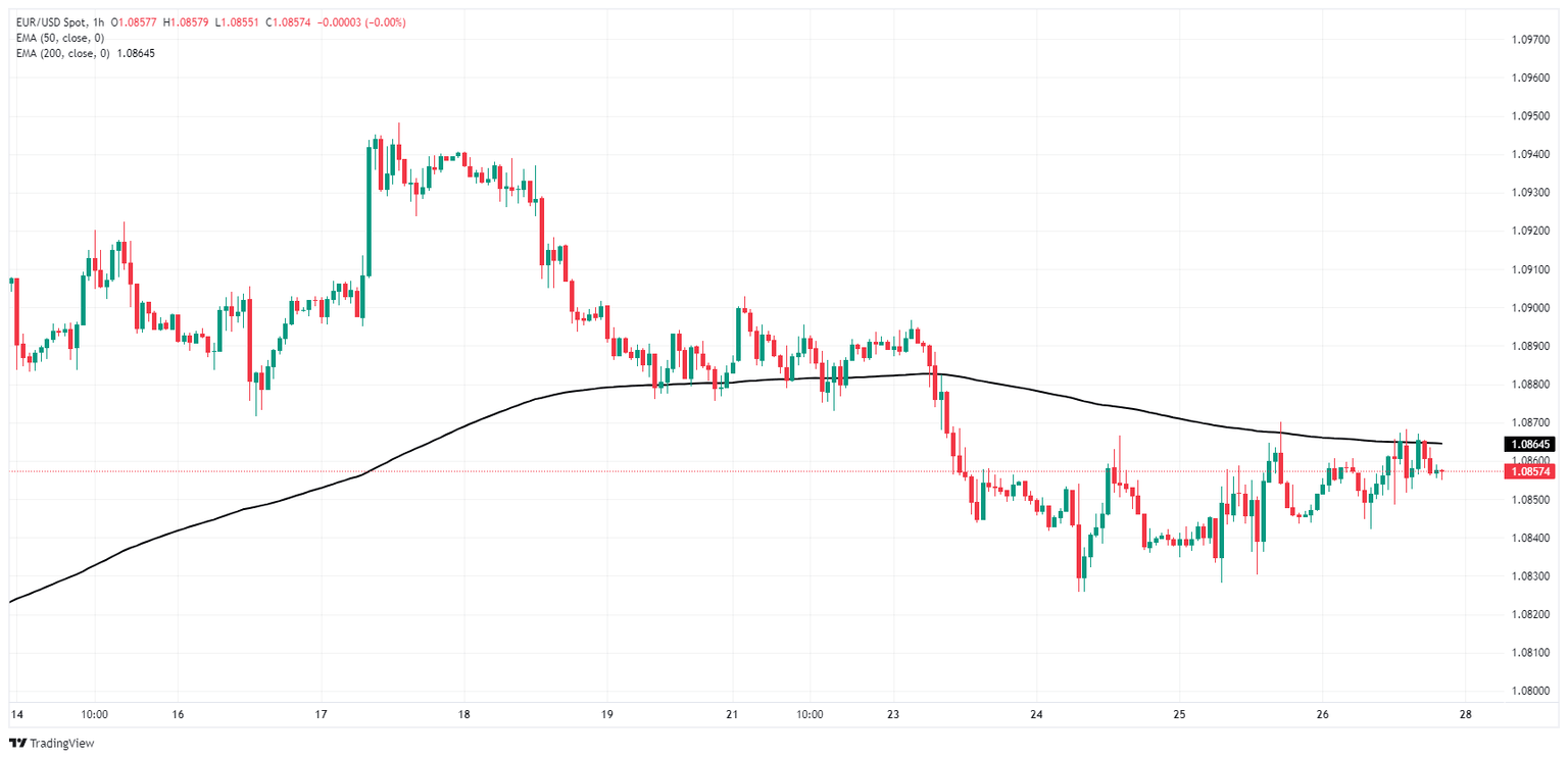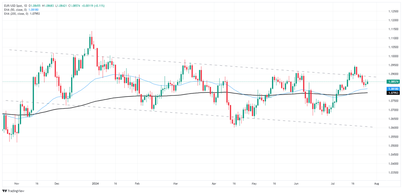 Despite finding a slim foothold and etching in a thin gain on Friday, the Fiber remains on the low side of a descending channel on daily candlesticks as bulls struggle to find momentum. Overall trend odds lean in favor of buyers as price action continues to hold above the 200-day Exponential Moving Average (EMA) at 1.0795, but upside chances are evaporating as EUR/USD slides back from recent peaks that failed to capture the 1.0950 level.