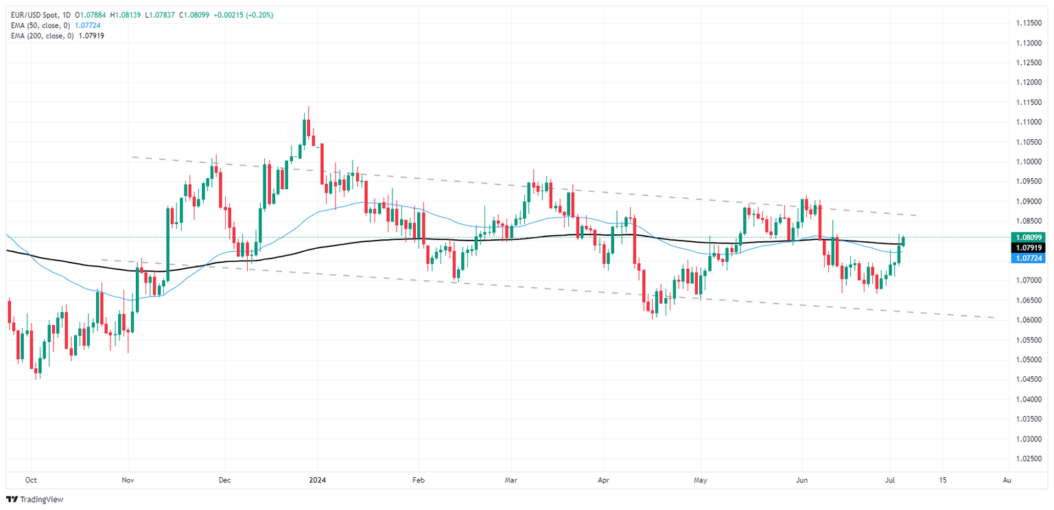 Fiber is poised to run out of bullish gas as bids extend past the 200-day Exponential Moving Average (EMA) at 1.0793. A firm push further into bull country will leave the Fiber poised for a challenge of descending technical resistance and the last major swing high into the 1.0900 handle.