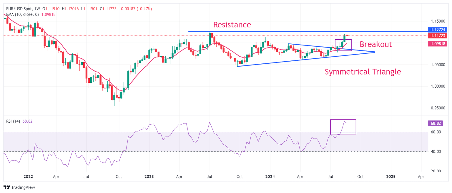 EUR/USD turns sideways after posting a fresh swing high at 1.1200. The major currency pair strengthened after a breakout of the Symmetrical Triangle chart pattern on the weekly time frame. The upward-sloping 10-week Exponential Moving Average (EMA) near 1.0940 supports more upside ahead.