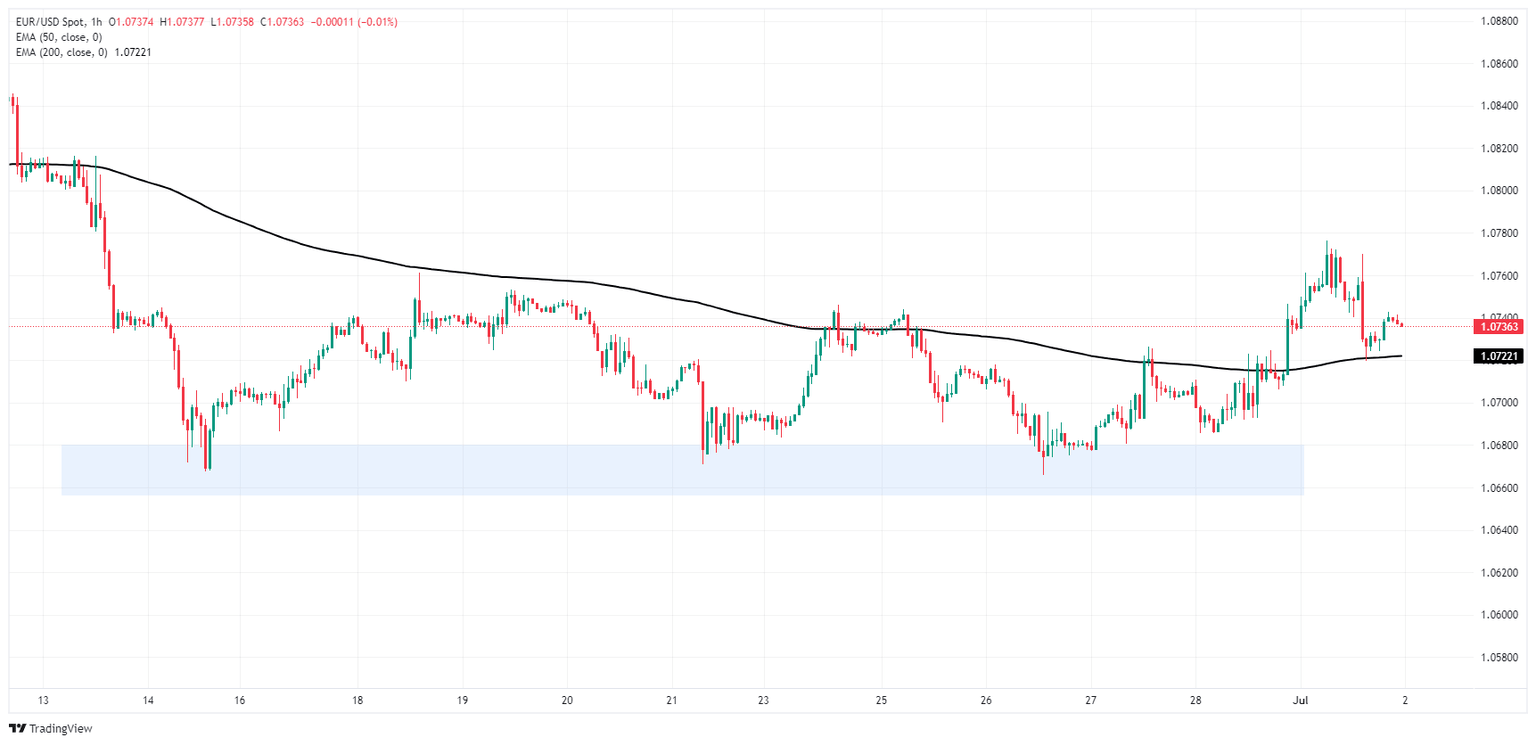 The Fiber kicked off the new trading week with a fresh push into 12-day peaks above 1.0770 before crumpling risk appetite dragged the pair back down to 1.0735. Intraday price action continues to lean into the midrange as EUR/USD grapples with the 200-hour Exponential Moving Average (EMA) at 1.0722.