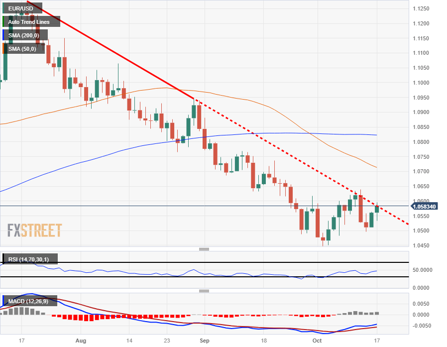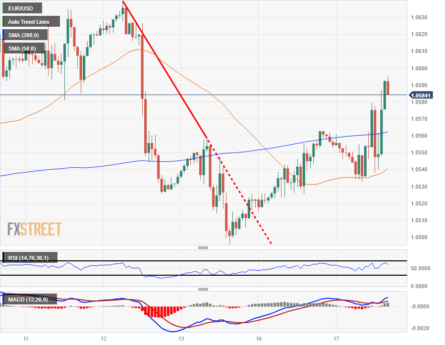 The EUR/USD firmly in the green for Tuesday after US Retail Sales beat market expectations and saw upside revision to previous figures, sending investor risk appetite into the ceiling and sending the US Dollar (USD) broadly lower, bolstering the Euro (EUR) and taking the EUR/USD up from the day's early low of 1.0532 and sending it within inches of the 1.0600 major handle.
