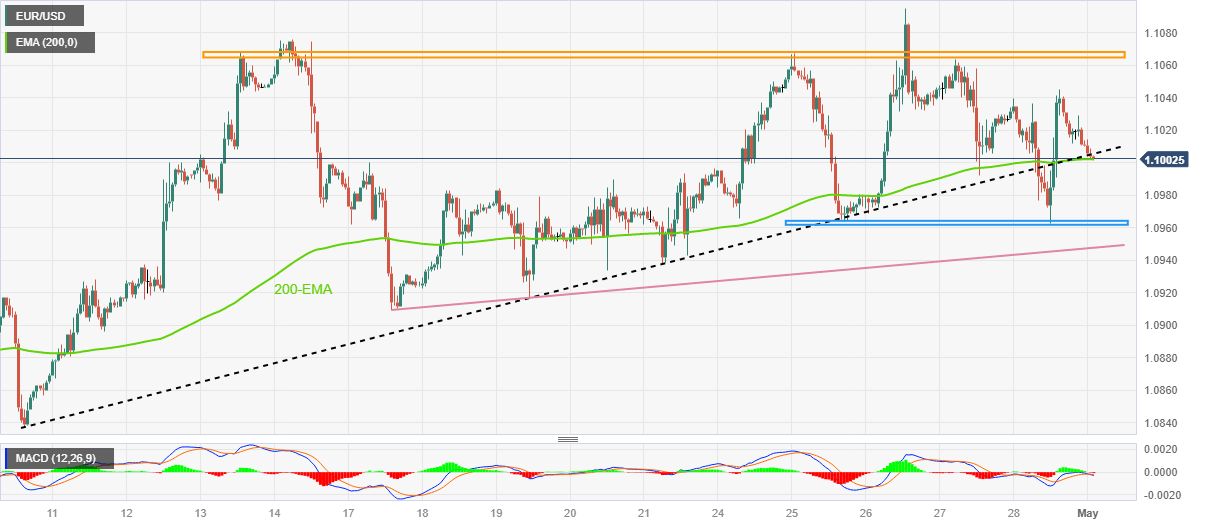In doing so, the Euro pair drops for the third consecutive day as it breaks the 200-bar Exponential Moving Average (EMA) and an ascending trend line from April 10.