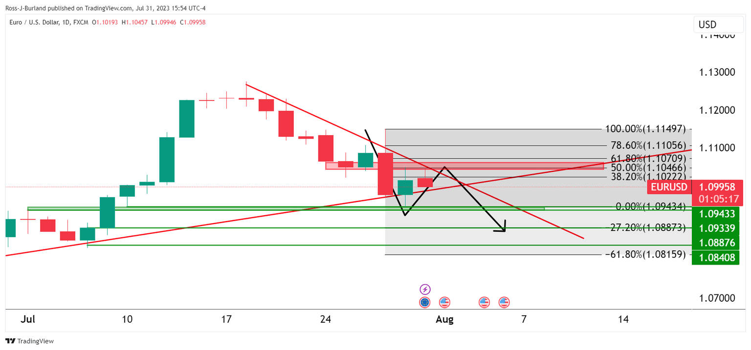 The Fed's quarterly Senior Loan Officer Opinion Survey, or SLOOS, which is directed both at businesses and consumers, also showed that banks expect to further tighten standards over the rest of 2023, Reuters reported. this is a sign rising interest rates are having an impact on the economy and the US Dollar has risen, driving the Euro towards trendline support again: