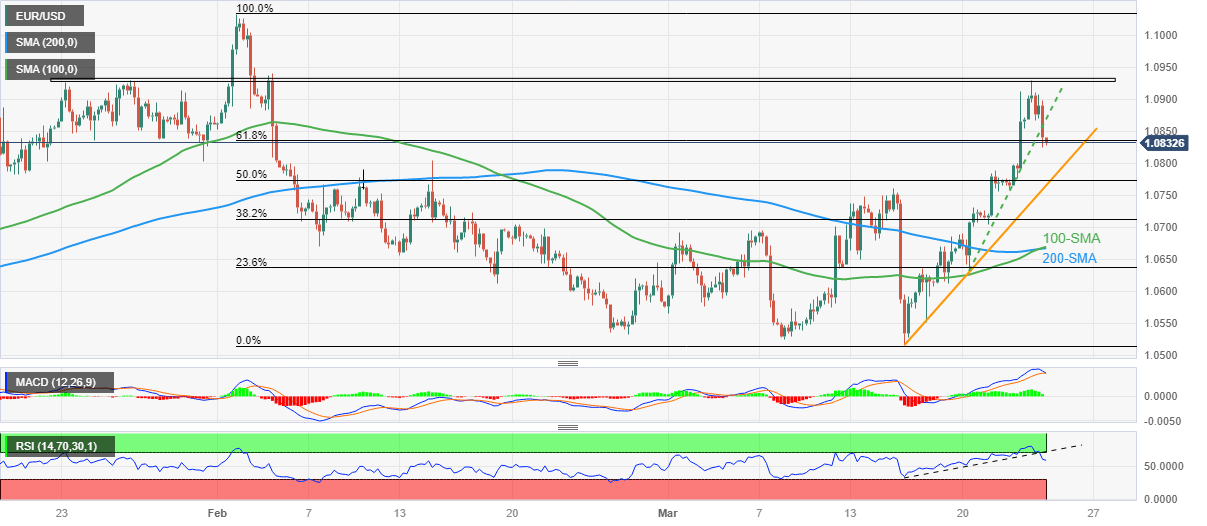 EUR/USD seesaws around 1.0830-20 as the key Fibonacci retracement level probes bears during early Friday, following the Euro pair’s U-turn from a seven-week high the previous day.