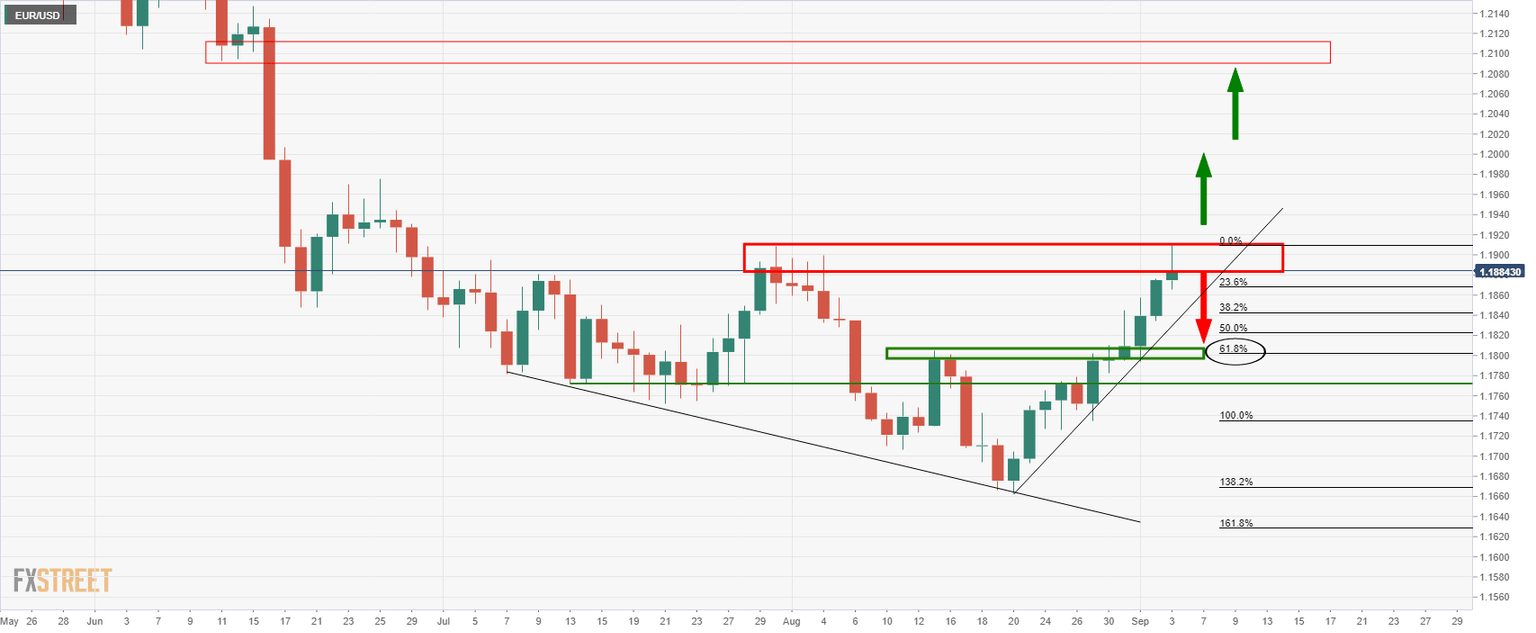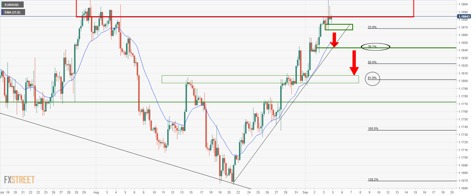 The price is meeting resistance in the 1.1880/00s which puts a focus on the downside for a meanwhile correction.