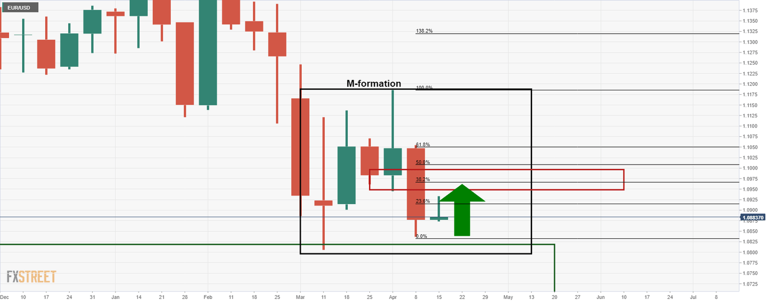 - EUR/USD bulls are moving in and eye the weekly M-formation.
