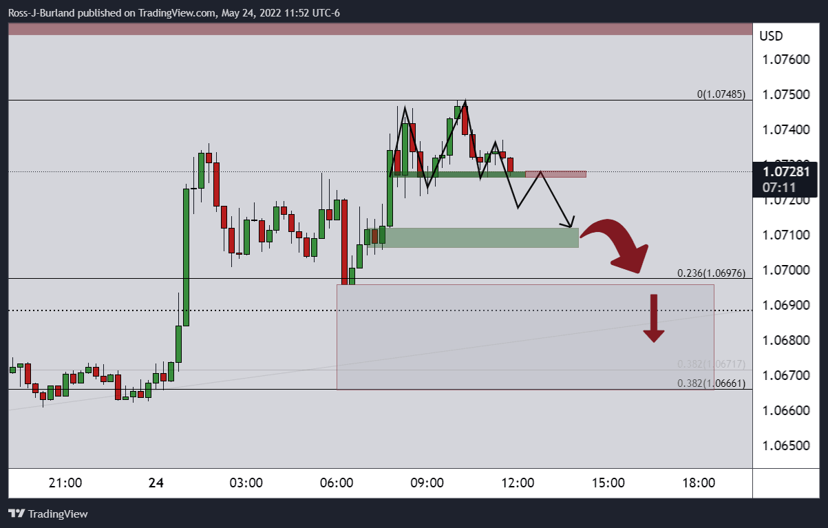 ''The bearish head and shoulders are a topping pattern that currently features in the 15-min time frame. A break of the neckline near 1.0725 could spell trouble for the committed bulls. A break of 1.0705 will likely open the way for further supply to mitigate the price imbalance towards a 38.2% Fibonacci retracement of the daily bullish breakout impulse near 1.0665 that guards a 50% mean reversion to 1.0640.''