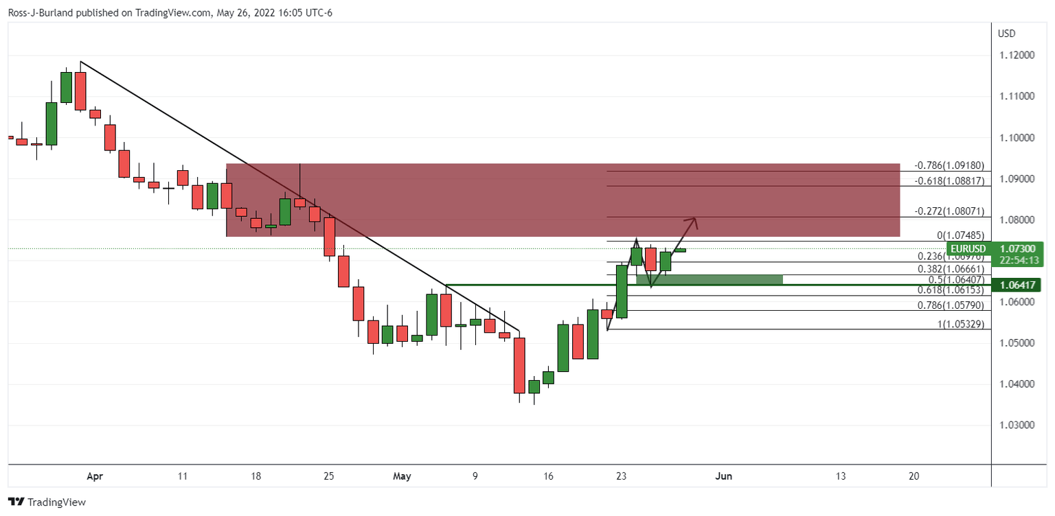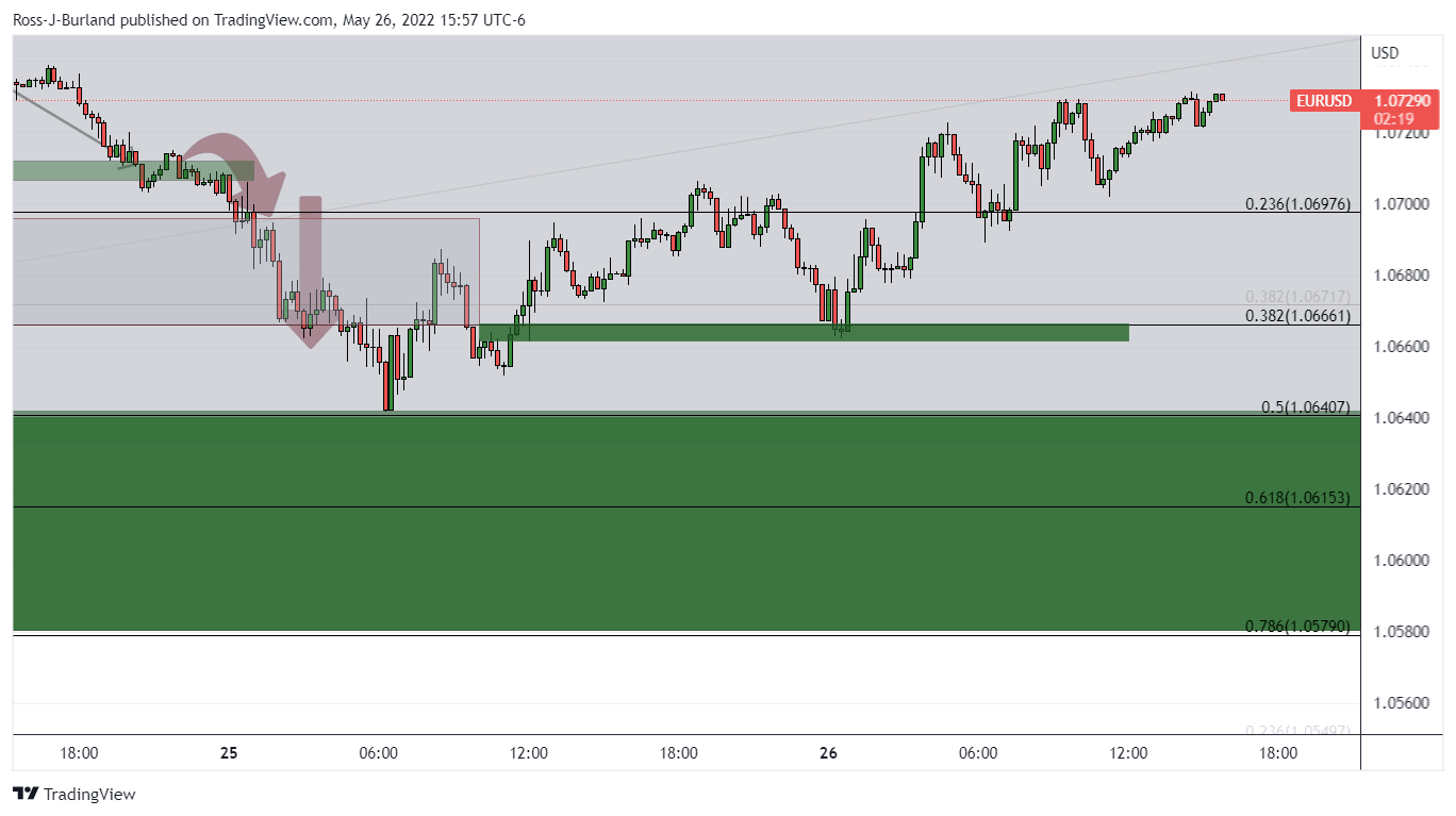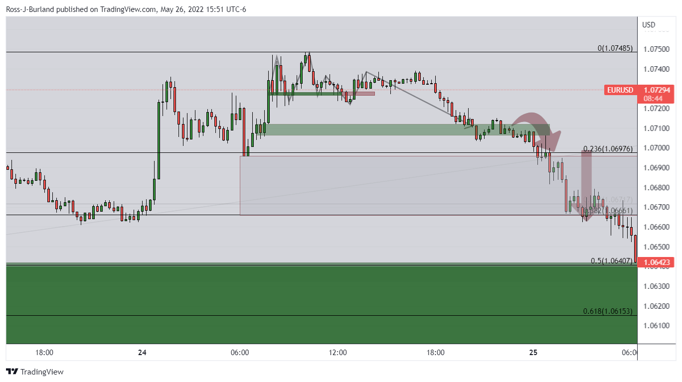 As per the prior analysis, EUR/USD Price Analysis: Traders looking for a catalyst from the Fed, bulls on a knife's edge, the euro, following initial mitigation of some upside eventually melted to the downside into the targetted area of 1.0640.