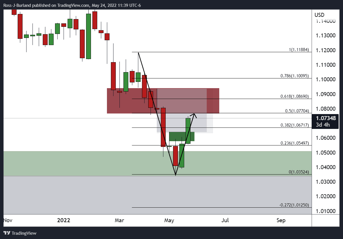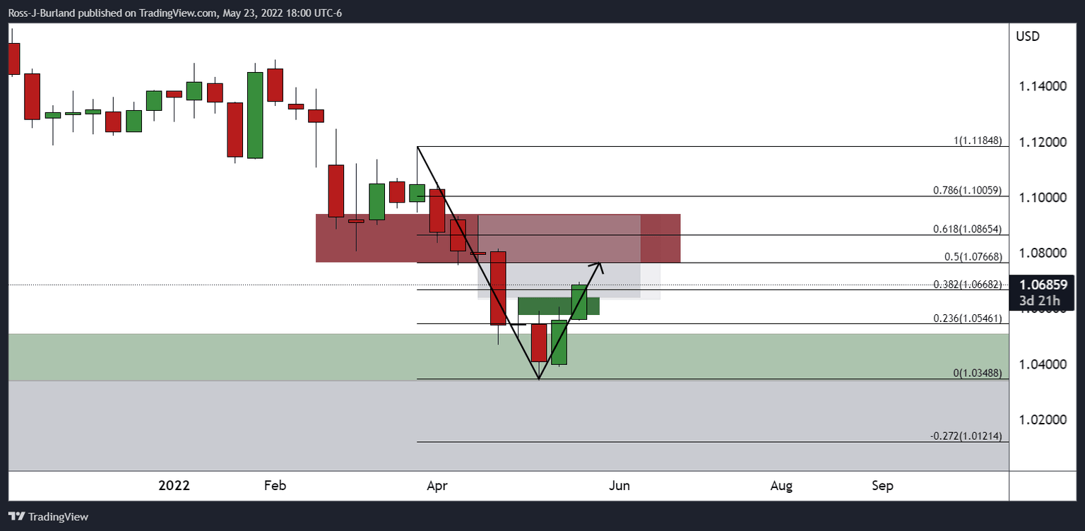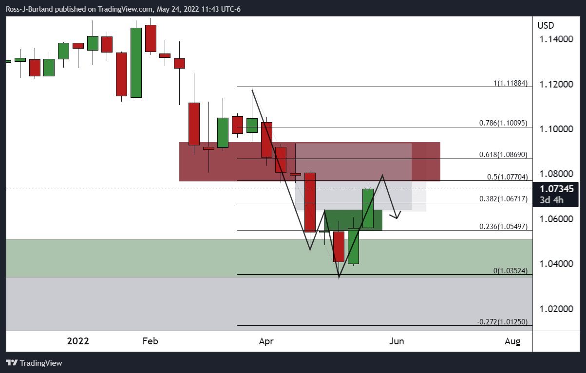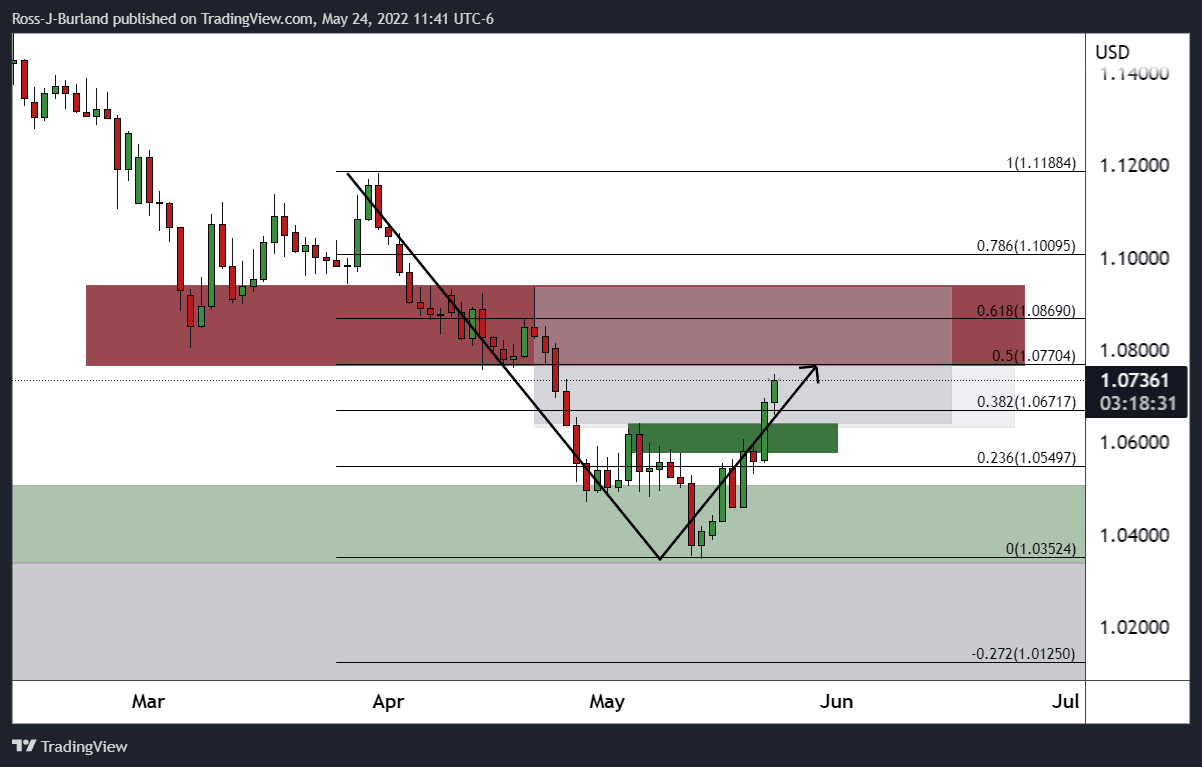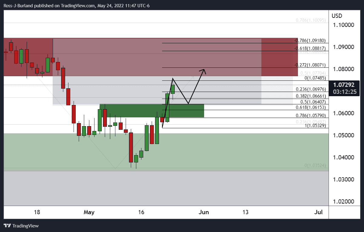 Breaking daily resistance in the opening sessions on Monday, EUR/USD breached the 38.2% Fibonacci of the weekly bearish impulse on Monday and has subsequently moved higher into the 1.07 areas with eyes on mid-late April daily swing lows near 1.0770. The following illustrates the bullish bias over a series of time frames.