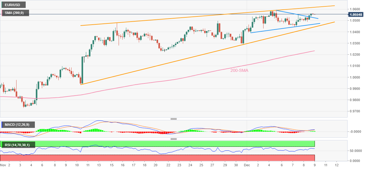EUR/USD struggles to justify the bullish triangle breakout near 1.0550-55 during early Friday. In doing so, the major currency pair probes the two-day uptrend while staying inside a one-month-old rising wedge bearish chart formation.