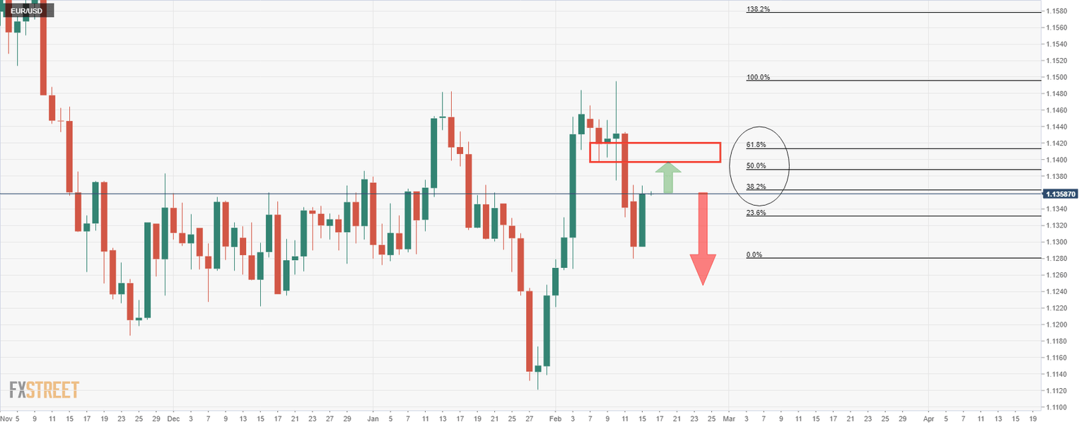 As per the prior day's pre-Europen analysis, EUR/USD bulls tread around with caution in a field of land mines and disruptive Russian headlines, whereby the euro was on a firmer footing and expected to continue higher, the price has moved in on the 38.2% ratio as follows: