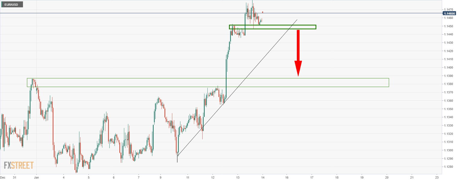 From a daily perspective, the bears will have their eye son at least a 38.2% Fibo retracement towards 1.14 the figure of not a full 50% mean reversion to the breakout point near 1.1380.