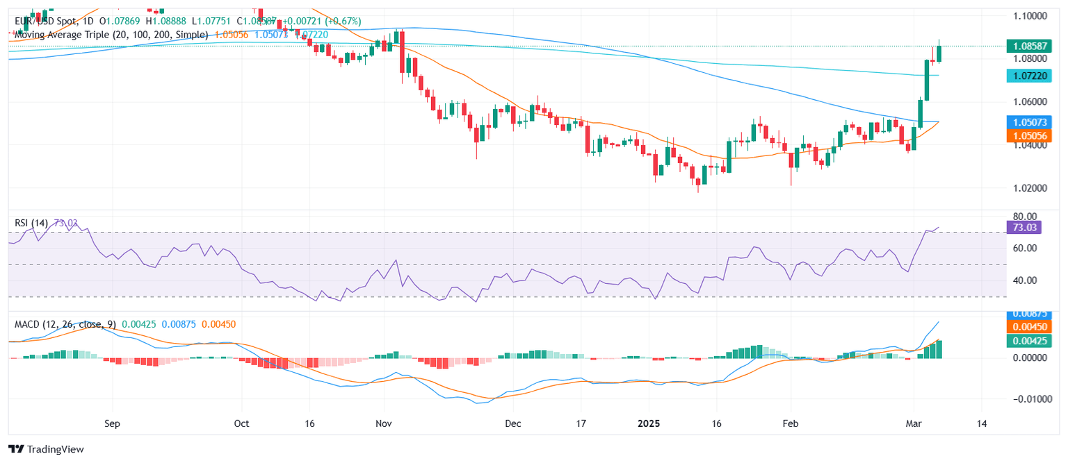 On the technical front, resistance is now seen near the 1.0900 zone, with a break above potentially opening the door for further gains toward 1.0950. On the downside, immediate support stands around 1.0800, followed by 1.0700 and well below the 20 and 100-day SMA convergence near 1.0500. If selling pressure emerges, a pullback toward these levels could signal a technical correction before another bullish attempt.