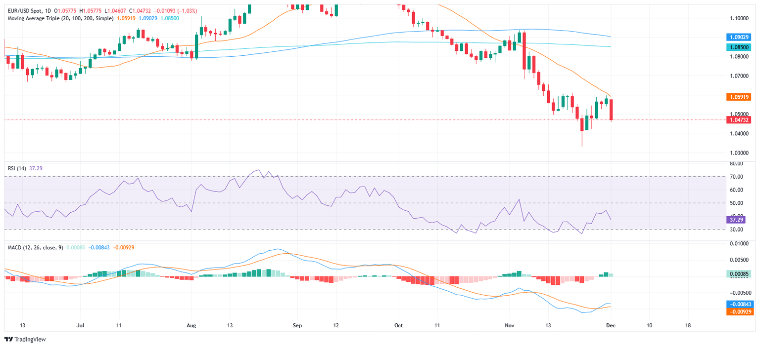 The EUR/USD pair kicked off the week with a sharp decline, falling over 1% and decisively breaking below the psychological 1.0500 mark. This move also pushed the pair further beneath the 20-day Simple Moving Average (SMA) which has acted recently as a strong resistance.