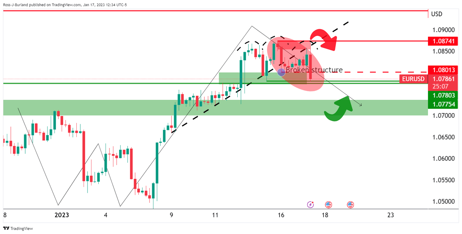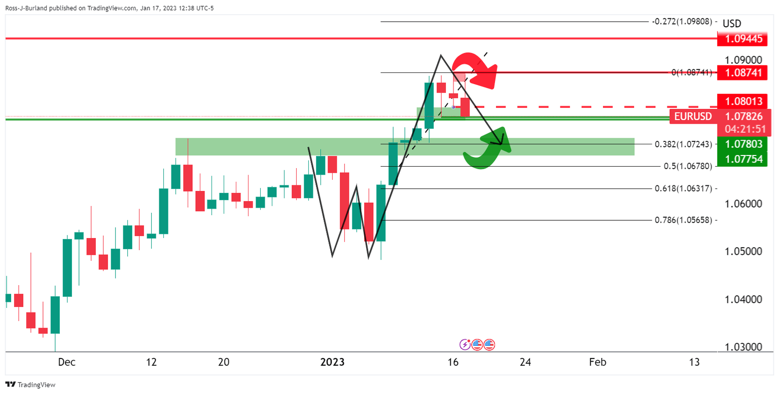 A downside thesis was in play as bulls ran into a trap with breakout traders enthused by the US Consumer Price Index and a move through 1.0800 into 1.0850. However, there has been no follow-through: