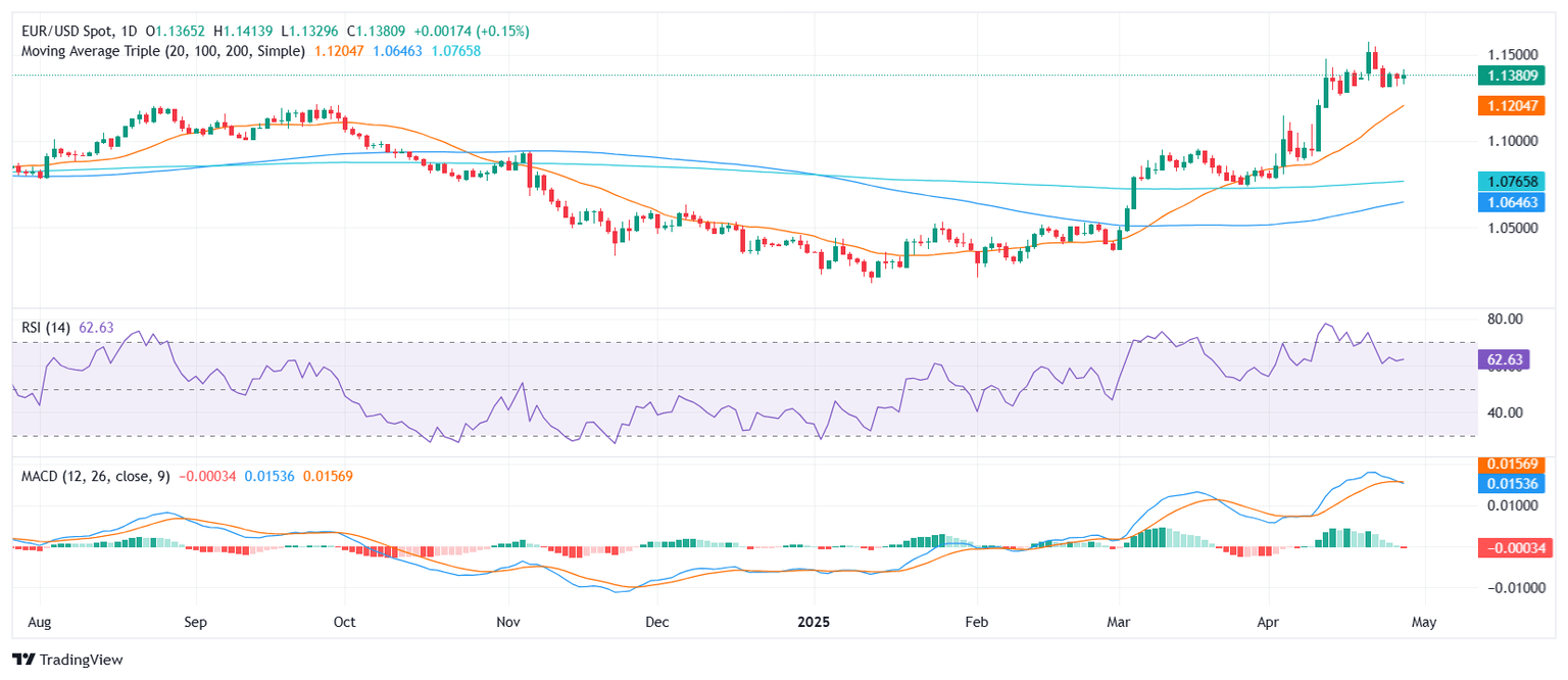 - EUR/USD trades around the mid-1.13/1.14 zone after gaining during Monday's session.