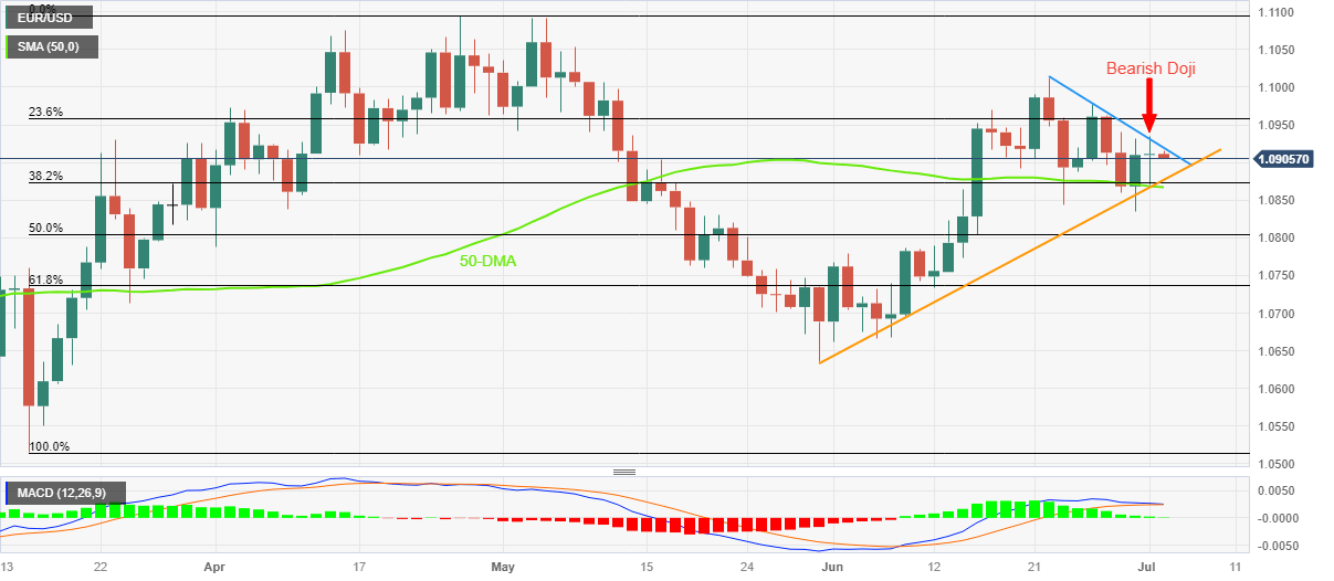 EUR/USD Price Analysis: Euro slips to 1.0900 on Monday’s Doji, downbeat MACD signals