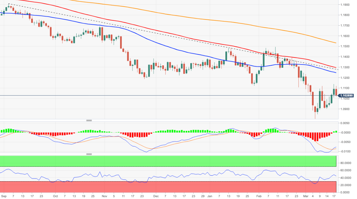 In case sellers push harder, a breakdown of the 1.1000 mark carries the potential to spark a deeper pullback to, initially, the 10-day SMA at 1.0975 prior to the weekly low at 1.0900 (March 14).
