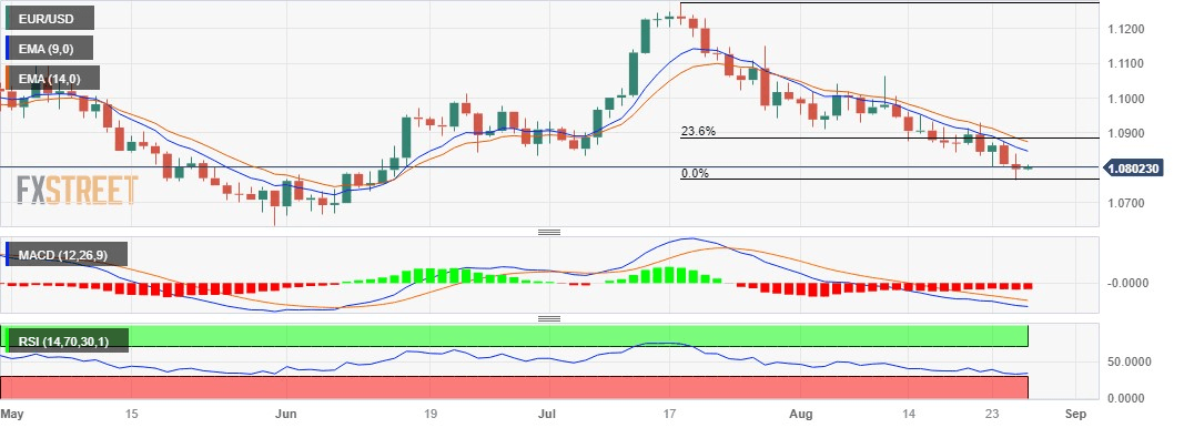 EUR/USD hovers above 1.0800 psychological level during the Asian session on Monday. The pair experiences upward pressure due to European Central Bank’s (ECB) policymakers defending their hawkish stance at the Jackson Hole Symposium.