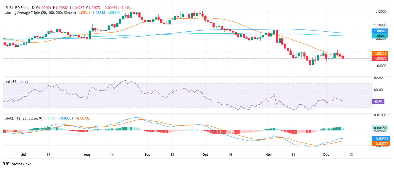 The EUR/USD pair extended its losses on Tuesday, retreating to 1.0525 and slipping slightly below the 20-day Simple Moving Average (SMA). This development undermines the pair's short-term constructive outlook, raising concerns about further downside risks if the 20-day SMA is definitively breached.