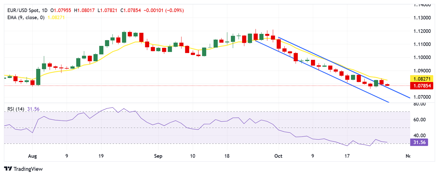 EUR/USD inches lower for the second successive day, trading around 1.0780 during the Asian session on Monday. A review of the daily chart shows that the pair tests the upper boundary to return to the descending channel pattern. which could reinforce a bearish bias for the pair.