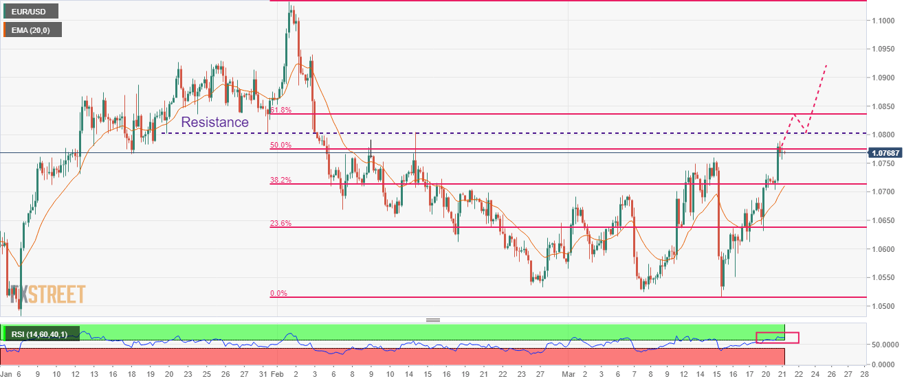 EUR/USD is struggling to extend the 50% Fibonacci retracement (placed from February 01 high at 1.1033 to March 15 low at 1.0516) at 1.0776 on a four-hour scale. Usually, a perpendicular rally in an asset is followed by a mean reversion to near the 20-period Exponential Moving Average (EMA), which is hovering around 1.0711, at the time of writing.